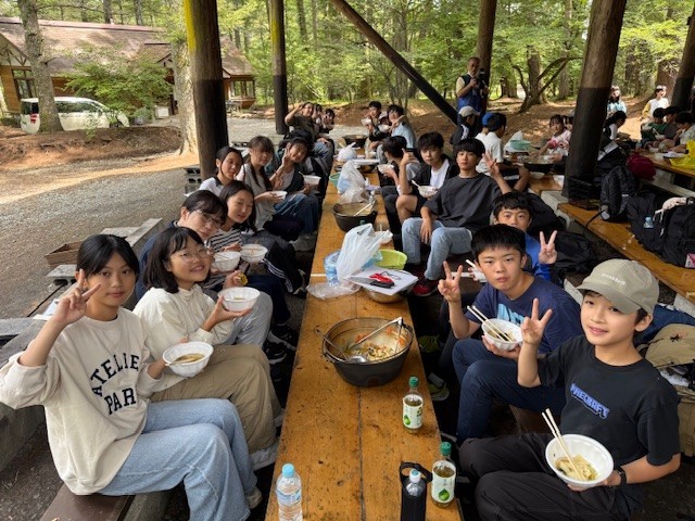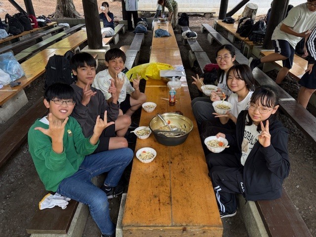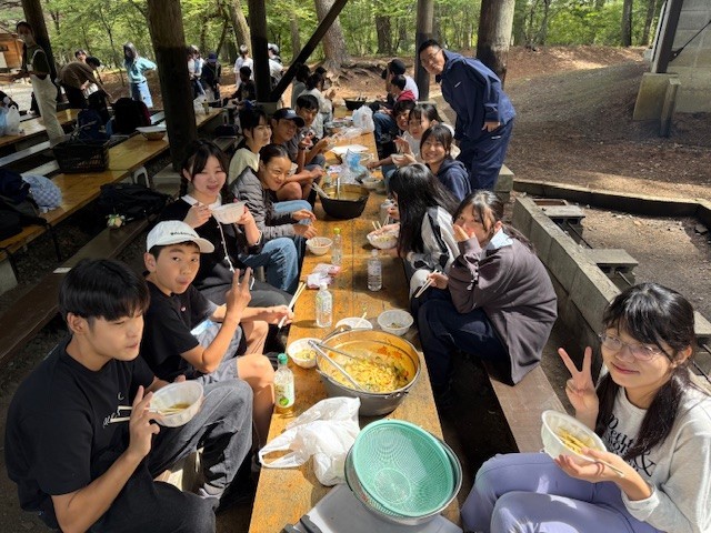 ほうとう鍋も完成して、みんな美味しく食べています。(右の写真、どこかに先生座ってます笑)
