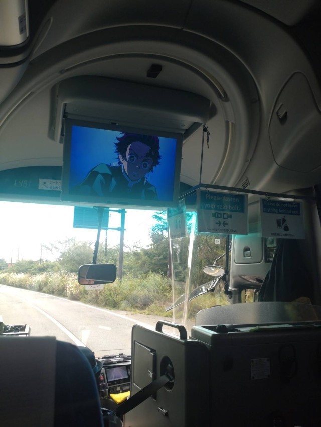 バスはいま最終目的地に向かっていますが、バス車内では映画鑑賞です!