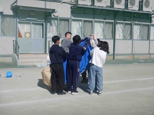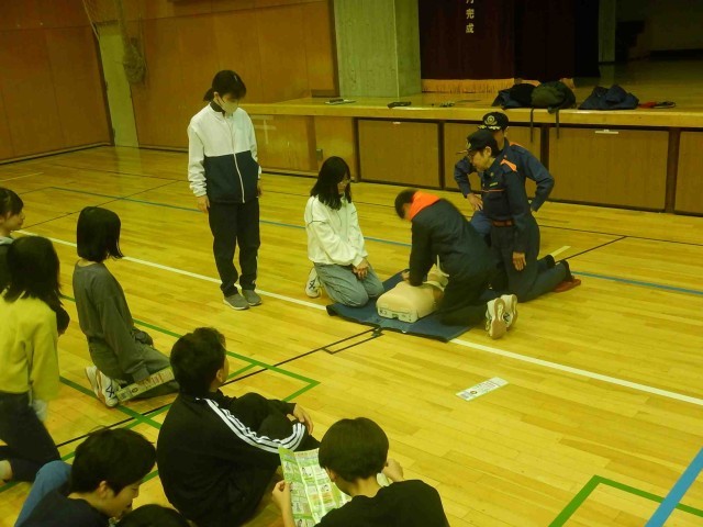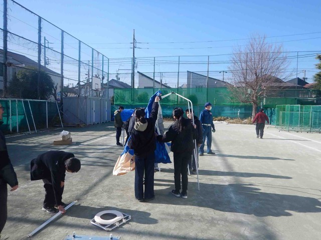 今日の午前中、防災訓練を実施しました。水消火器訓練と担架搬送訓練、AEDの訓練をローテーションで行った後に、玉川消防署の方から防災講話をいただきました。その後、マンホールトイレの設営訓練とアルファ化米調理に分かれて体験をしました。