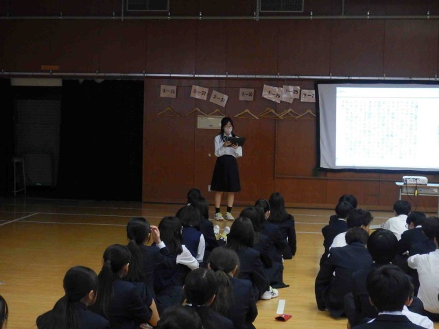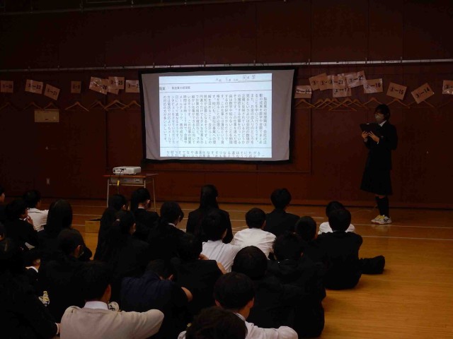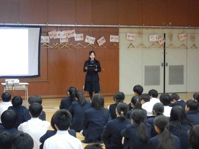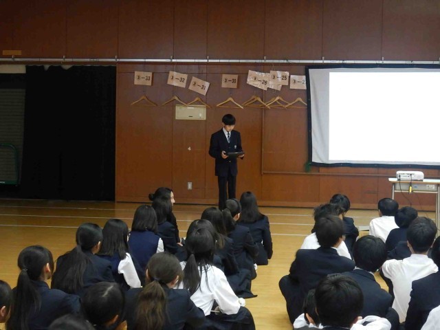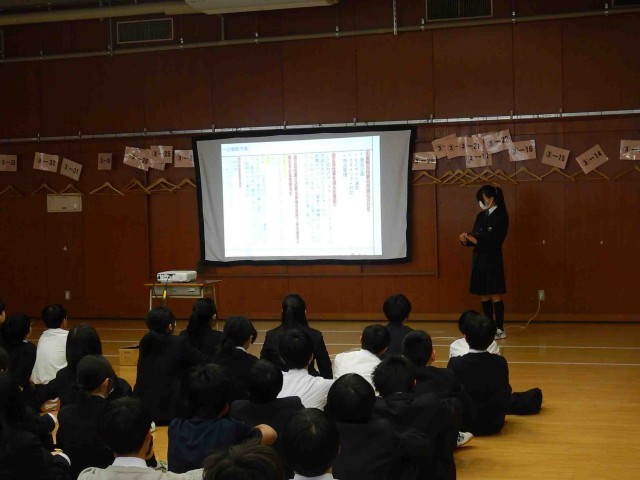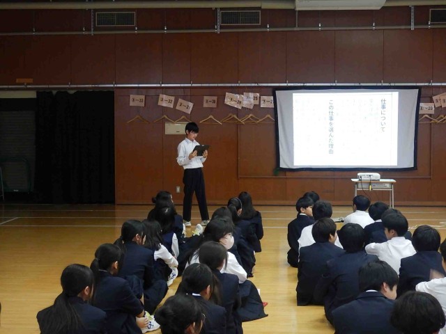 1学年による職業インタビューの学年発表会の様子です。お仕事をされている方に、必要な資格や仕事内容やその魅力に加えて、中学生へのアドバイス等についてインタビューし、まとめたものを発表していました。