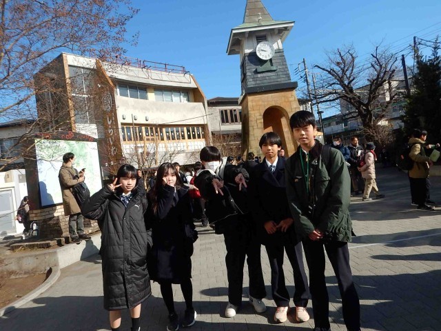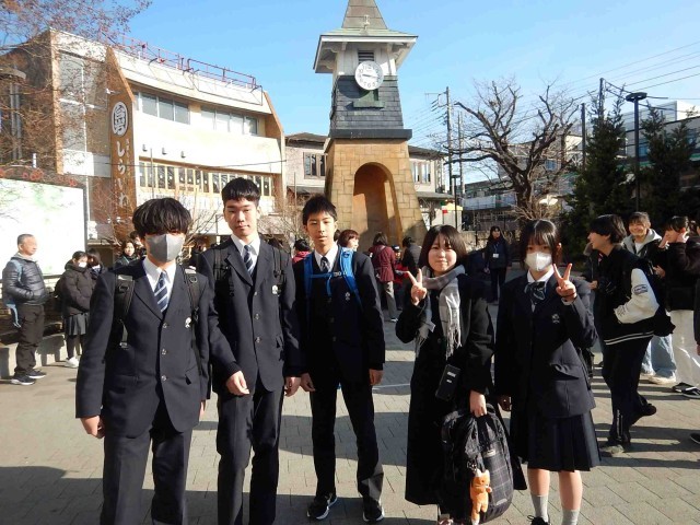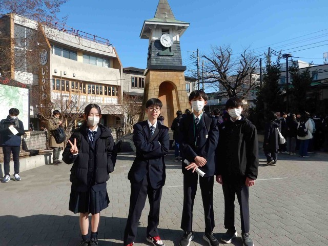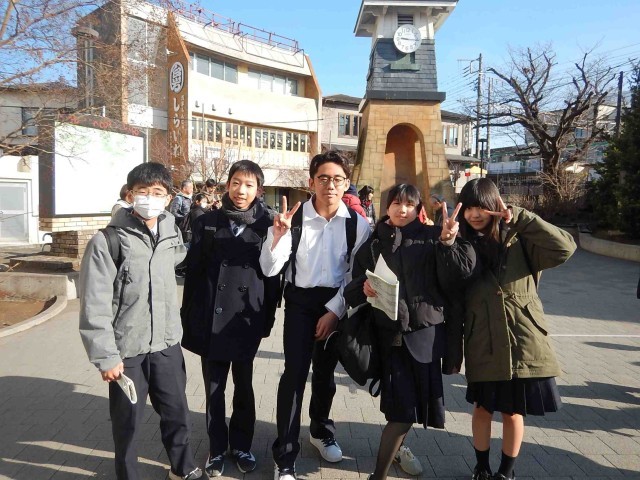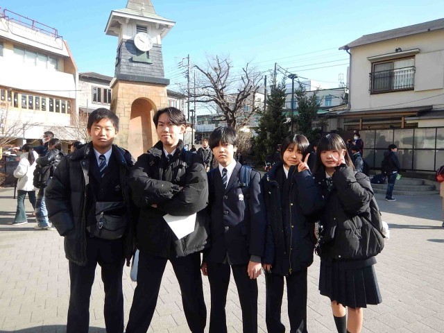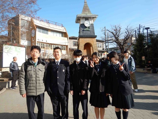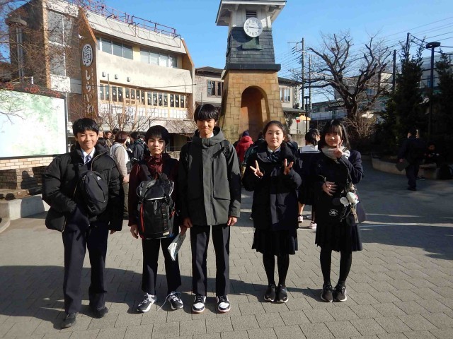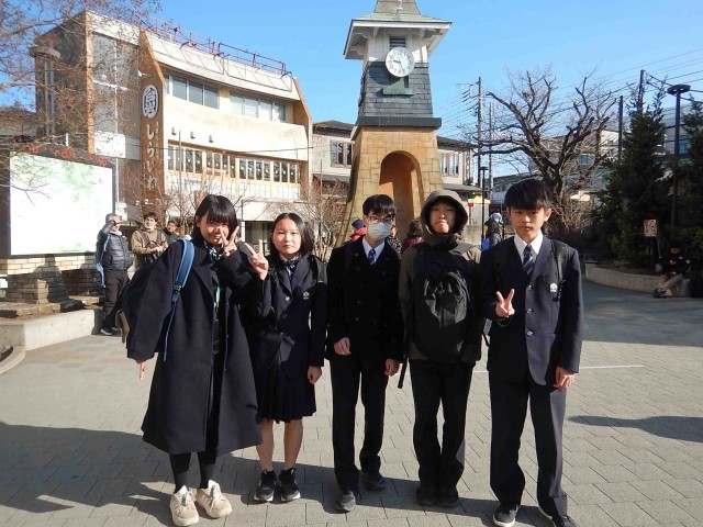 鎌倉校外学習に行ってきました。写真は、朝、鎌倉駅に到着しチェックポイントで会った班です。