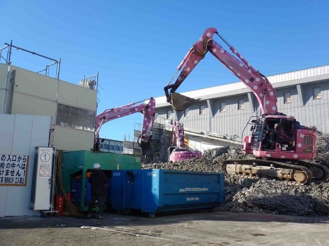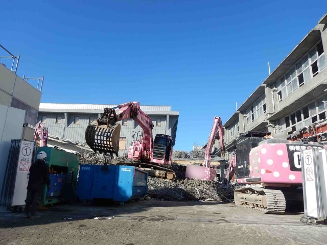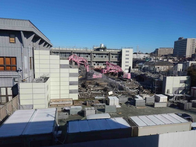 南校舎の解体がさらに進んでいます。校舎の本体部分はほとんどなくなりました。南側の仮囲いも撤去が進み、仮設校舎から様子を見ることができるようになりました。