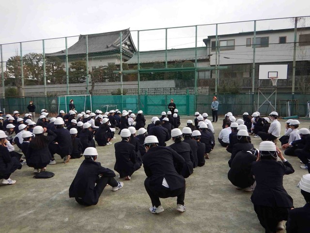地震を想定した避難訓練が行われました。今年度、区から配備されたヘルメットを着用して避難する訓練を行いました。初めてでしたが、比較的スムーズに行動できました。