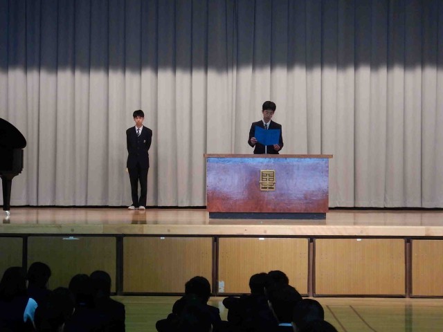 今日、修了式がありました。卒業式を終え、1,2年生のみでの式でした。各学年の代表生徒が3学期を振り返っての話をしました。また、校歌の指揮者、伴奏者も今日から新しく代わりました。