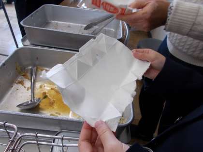 給食2日目になりました。今年度から、2年生が牛乳パックリサイクルを行っています。前の学校で経験していたという生徒が、長方形に開くやり方をレクチャーしてくれました。上手にできる方法を探りながら、リサイクルに取り組んでいきたいと思います。