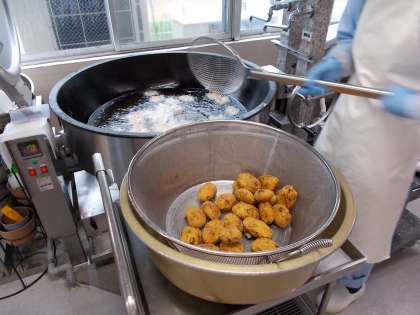 給食のコロッケは、じゃがいも(45kg)を蒸すところから始まります。たねを作り丁寧に成形して衣をつけ、油で揚げていきます。大人気のおかずだからこそ、丁寧に作ることが求められます。