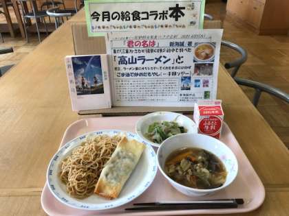給食コラボ4月21日 公開日 2021/04/21 更新日 2021/04/21 給食コラボ 新年度、第1回目の本と食を繋ぐ給食コラボは新海誠「君の名は」から 高山ラーメンともやし炒めが登場しました。英語版のBGMが流れる中、 おいしくいただきました。 いいね(0)