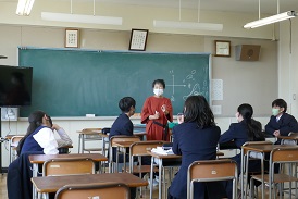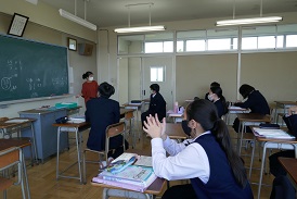 1年生の数学です。身の回りの「数学的に考えること」について話し合っていました。「面積なんて学習しなくても大人になれる」と言っていたのに、「奥中の土地を売ったらいくらだろう」という話になり、それには面積を知ることが必要、「面積はどうやって測ればいいだろう」「地図を使って、縮尺を考えて」と、やっぱり数学は必要なことが分かります。