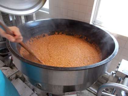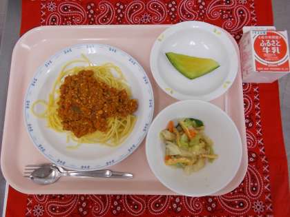 スパゲティミートソースは、小学校の時から慣れ親しんだ献立です。今日は『ソイ』大豆入りで作りました。たくさんの野菜とひき肉、それに調味料をじっくり煮込んで作るミートソースは、大人気メニューの1つです。