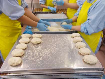 今回のコロッケは『肉じゃがコロッケ』です。甘辛味の肉じゃがをたねにして、衣をつけ油で揚げます。味がついているので、ソースなしでいただきましょう。