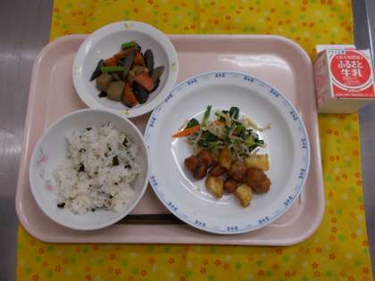 ・梅わかごはん ・牛乳 ・かつおの竜田揚げ