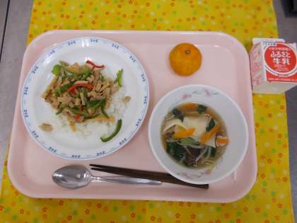 ・青椒肉絲(チンジャオロウスー)丼 ・牛乳