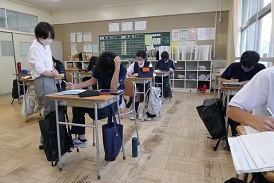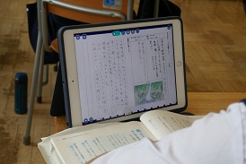 3年生は窓外の雨音をよそに、俳句の鑑賞文を書いています。自分のノートを読みかえしたり、ロイロノートで配られた先輩の作品を参考にしたり、詠まれている事物の画像を探したり。