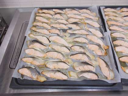 今日は、和食の献立です。鮭の照り焼きは下味をつけて焼きますが、それだけでは『照り』がでないため、バットに並べたあとに照り焼きのたれをかけて仕上げます。