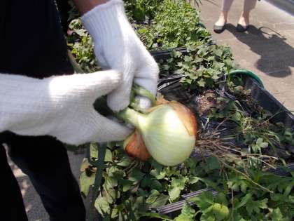 期末考査が終わり、6月の専門委員会がありました。昨年度11月に後期保健給食委員会で植え付けしたたまねぎが大きく育ったので、前期保健給食委員で収穫をしました。乾燥させて、7月の給食で使用する予定です。