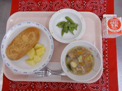 今日は、今年度初めてのきな粉揚げパンです。小学校のときより大きくなった揚げパンにさらにポテトがつくことに驚いた1年生もいたようです。(※小学校のエネルギー基準量は650キロカロリー、中学校は830キロカロリー。その差180キロカロリーです。)