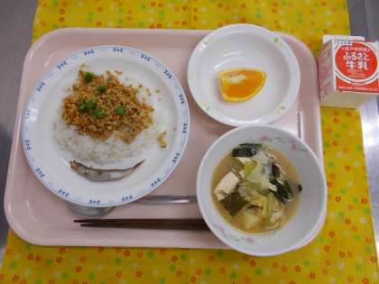 7月2日 本日の給食 公開日 2021/07/02 更新日 2021/07/02 給食室より 今日の献立は、 ・高野豆腐のそぼろ丼 ・牛乳 ・焼きししゃも ・キャベツのみそ汁 ・バレンシアオレンジ です。 【食材産地】 米 秋田県 しょうが 高知県 にんじん 千葉県 ねぎ 埼玉県 さやいんげん 茨城県 キャベツ 茨城県 じゃがいも 茨城県 こまつな 千葉県 バレンシアオレンジ 和歌山県 鶏肉 青森県 いいね(0)