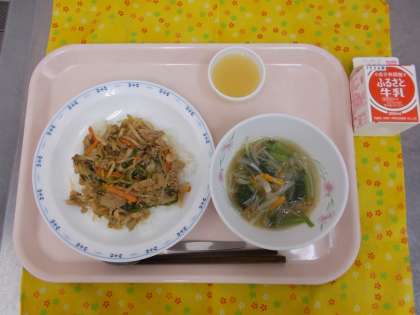 今日は、たっぷりの肉と野菜を炒め合わせたプルコギ丼です。韓国語で、『プル』=焼く、『コギ』=肉 という意味があります。味つけをしっかりするため、レバーも加えて鉄分やビタミンAを補いました。