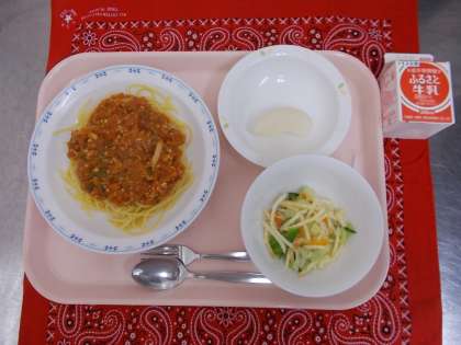 ・キクりんが作ったミートスパゲティ ・牛乳