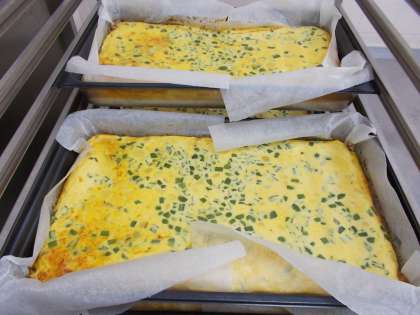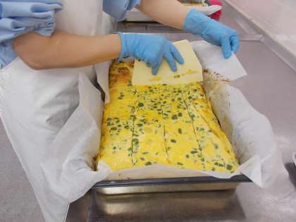 今日は、じゃがいもがたっぷり入ったオムレツです。家庭ではフライパンで焼きますが、給食ではオーブンを使って焼いていきます。大きな天板に1枚あたり4kgの卵液を流しこみ、じっくり焼いてから36等分に切り分けます。