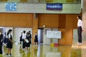 学芸発表会準備期間に入り、慌ただしい中ですが、後期初めての生徒会朝礼が行われました。並べるところから生徒が進行し、しっかりと会を開くことがでいました。