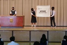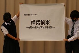 新生徒会長より、「人とのつながりを大事にしたい。自主性を高めたい」という言葉があり、スローガンも披露されました。挨拶の「挨」が入っていますね。人とのつながりはあいさつが第一歩です。