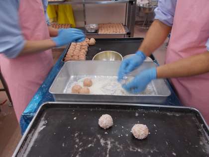 今日は、珍珠丸子、肉団子のもち米蒸しを作りました。肉団子にもち米をまぶし、給食室のスチームコンベクションオーブンで時間をかけて蒸しあげます。肉団子には豆腐やおからも加えてあります。