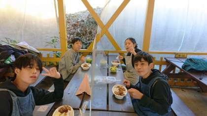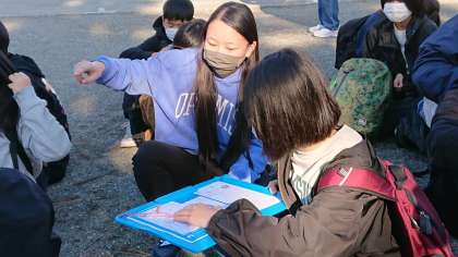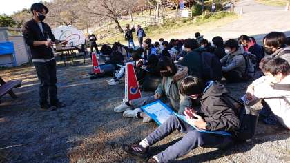 無事に美味しいカレーができました。食後はオリエンテーリングです。まずコンパスのつかいかたを確認。