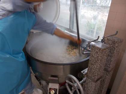 献立作成者の生徒から、家で作ったものに近い味でしたという言葉をいただきました。炒め物(チャプチェ)は大量調理では難しい料理ですが、火力全開でおいしく仕上げてくれました。残りもほとんどなく、好評でした。来週は、1Bの生徒作成献立を実施します。