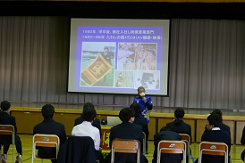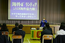 1年生は英語の授業として異文化理解、ボランティアをテーマにしたお話を聞きました。講師の梶先生は、青年海外協力隊としてスリランカで活動したことを皮切りに、いろいろな社会貢献活動をされています。