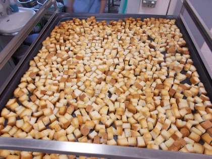 今日は、クラムチャウダーにクルトンをつけました。このクルトンは、トーストで使う食パンの『みみ』を利用して作っています。小さなことでも、SDGsに貢献できればと思います。