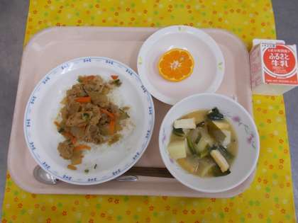 冬は大根がおいしい季節です。今日は、大根をたっぷり使ったおろし豚丼です。甘辛い味つけで、ごはんも具も空っぽで返ってくるクラスが多かったです。