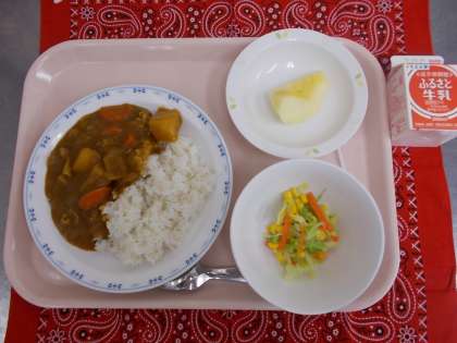 学校給食週間3日目の献立は、カレーライスです。米飯給食は、昭和51年(1976年)ごろから導入されました。それまでは、給食の主食はパンが多かったので、『カレーシチュー』として登場していました。今日はどのクラスもほぼ売り切れ、やはりカレーライスは不動の人気メニューです。