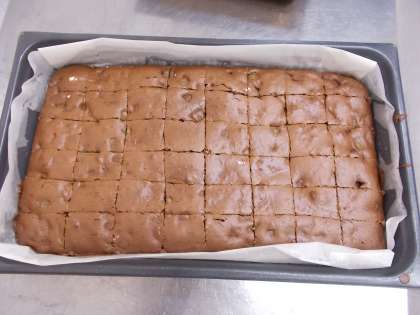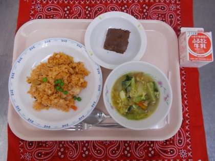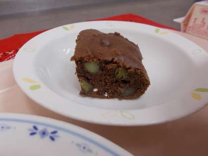 今日はバレンタインデーです。そこで、給食室から奥中のみなさんにブラウニーを焼きました。ココア生地にさつまいもの黄色が映えます。どのクラスにも給食室の愛情が伝わったようで、残りはほとんどありませんでした。