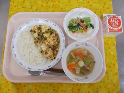 今日は、★塩ナムル が3年生のリクエストです。奥中で大人気の麻婆ライスと組み合わせ、中華メニューにしました。3年生は明日から修学旅行です。気をつけて行ってきてください。