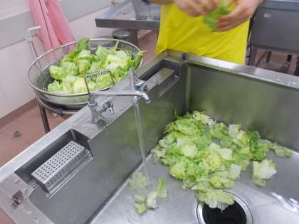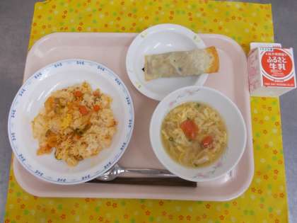 今日は生徒作成献立。ウインナーとレタスが入ったキムチチャーハンです。レタスは大きくちぎって、炒めた具の最後に加えました。スープにはトマトが入って、色よく仕上がりました。