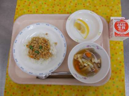 今日は、みじん切りにした高野豆腐を鶏ひき肉・野菜とともに炒めて作ったそぼろ丼です。高野豆腐がだしをたっぷり含んで、口の中でうまみが広がります。