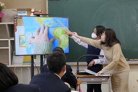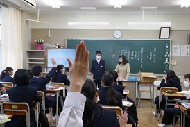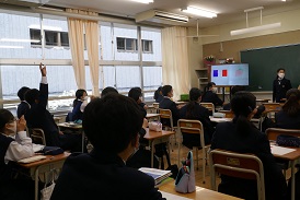 1年生の社会科は、地名クイズを生徒がつくって出題するという学習活動をしていました。「犬みたいな形の県は?」「面積が一番小さい県は?」「アメリカ合衆国の首都は?」みんなよく知っているようでたくさんの手が挙がります。国旗当てはなかなか難しく、ヒントを出してもらったり。最後は地図で確認をしていました。