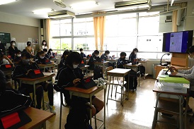 1年生は総合学習。SDGsと河口湖・富士山をテーマにした新聞の発表をiPadを使って行っていて、廊下まであふれている保護者の方々に見ていただくことができました。