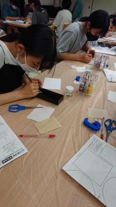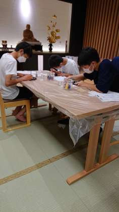 夕食後は漆器に模様や絵を書く加飾体験。みんな熱中していました。