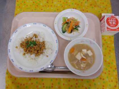 今日は鶏ひき肉と野菜、それに高野豆腐を一緒に炒りつけたそぼろ丼です。ごはんが進む甘辛い味付けです。