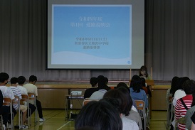 土曜日授業を利用して3年生は保護者の皆さんとともに進路説明会に臨みました。前半は進路決定までの流れなどの説明。ここでは今年から導入される都立高校の英語スピーキングテストについての情報もありました。