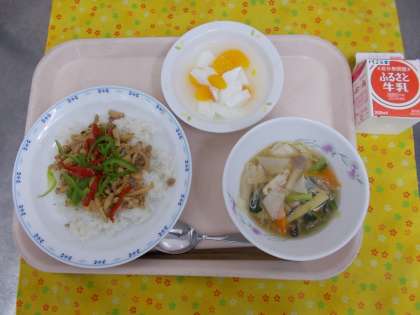 今日は、中華料理を組み合わせた献立です。細切りにした肉と野菜を炒めた青椒肉絲には、豚レバーミンチを加えて鉄分強化をしています。大量調理の炒め物では水が出やすいため、高野豆腐も加えて汁けが出ないようにしています。デザートは杏仁を使わない『乳ない豆腐』です。固めた牛乳かんをひし形に切り、シロップ・みかんの缶詰と合わせました。