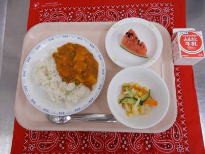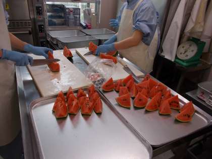 今日の果物は、小玉すいかです。茨城県産の『姫甘泉』(ひめかんせん)という品種の大きなすいかが届きました。今日はこれを1/24に切っていきます。くし形に1/8に切ったあと、真ん中から3等分、60度にカットします。給食室では果物やオムレツなどを『等分に切る』という作業で数学も使います。