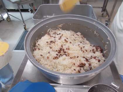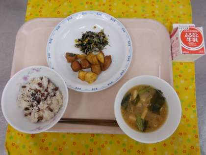 今日は、開校記念日のお祝いで赤飯を炊きました。ささげの煮汁を加えて炊いています。あとから上にかけた『ごま塩』も給食室で手作りします。ごまを炒る際、塩と少しの水を加えて、ごまを塩でコーティングするようにして作ります。