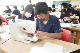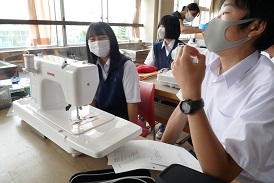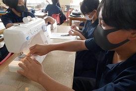 家庭科はミシンの糸かけ練習中。これが難しいようです。でも和気あいあいの2年生、難しいけど楽しそうです。