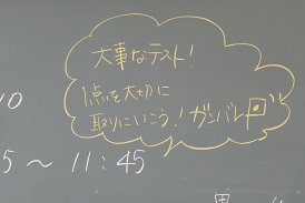 大事なテスト 公開日 2022/06/23 更新日 2022/06/23 コラム 今日から期末考査。1年生は初めての定期テストです。緊張が走ります。 一方三年の教室には「大事なテスト 1点を大切に取りに行こう ガンバレ!」という担任の熱いメッセージが。 いいね(0)