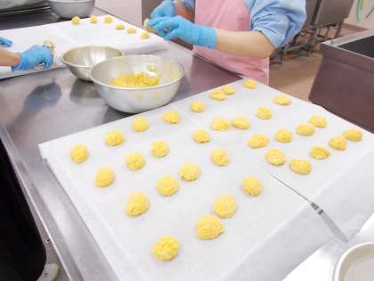 写真1枚目:サーターアンダーギーの生地を丸めている様子