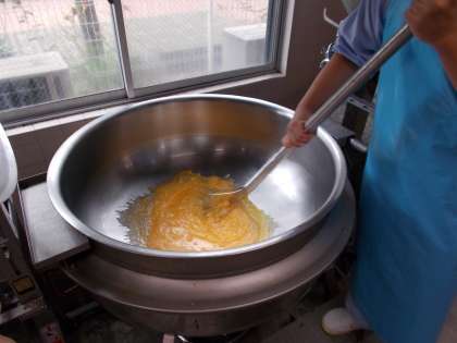 写真2枚目:にんじんしりしりの炒りたまごは、大きな泡立て器で混ぜて作ります。