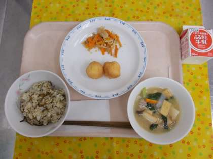 今日は、沖縄慰霊の日です。そこで沖縄のメニューをそろえました。沖縄県では豚や昆布をよく使います。みそ汁は白みそ仕立て。デザートはドーナツのようなサーターアンダーギーです。小麦粉・卵・砂糖を合わせた生地を練り、1人2つに丸めて低温の油で揚げると、外はサクサク、中はフワフワに仕上がります。